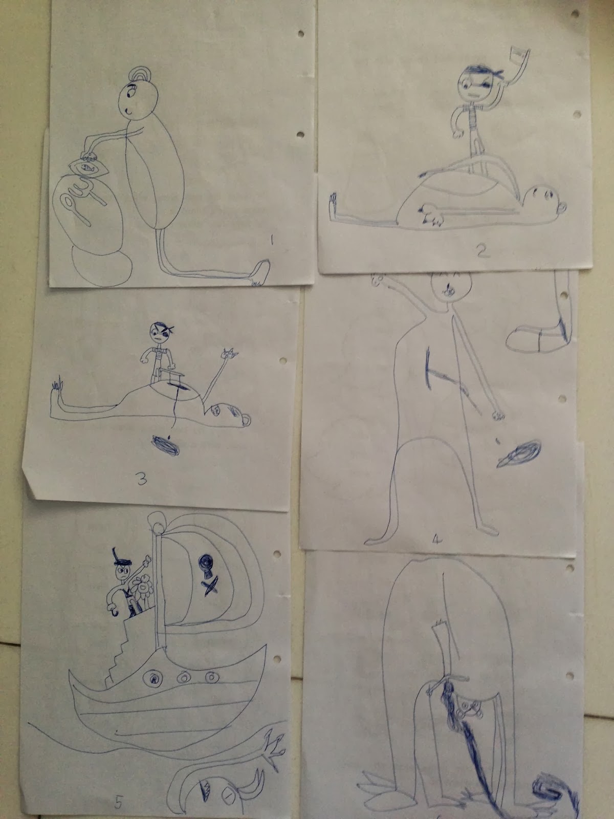 The educator in us is saddened. We see before our eyes what Ken Robinson was talking about when he spoke about schools killing creativity. Jordan, the one who drew at every chance she got, wasn't drawing anymore. And when she did draw, it didn't amount to very much. Her drawings seemed to reflect her mood; blah and uninterested. Then yesterday, we kept her home because she had a ear infection. She was the happiest child in pain I had ever seen. She had an entire day at home with nothing to do and no school to go to. And what she did was draw. Draw and draw and draw. She drew a mildly disturbing narrative of a pirate killing a bear for food but it was coming of her in oodles. She seemed free of the artistic constipation that seemed to have defined her for the last month. I spent most of last night picking up scraps of paper all over the house that she had drawn on.